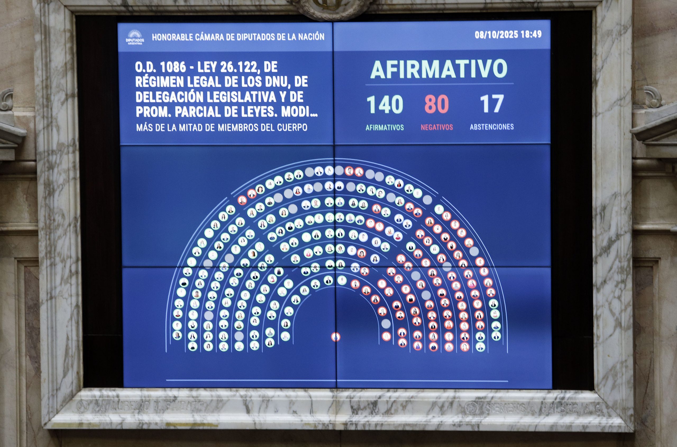 Sin embargo, más allá de la votación en general, la oposición no pudo convertir este miércoles en ley el nuevo régimen de DNU, al no haber conseguido la mayoría absoluta de 129 votos en uno de los artículos de esa iniciativa, lo que le dio un respiro al Gobierno, aunque el Senado podrá insistir con la media sanción en una próxima sesión.