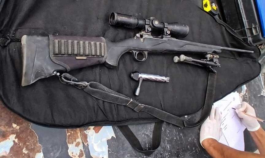 En la cabina y luego a rebatir el respaldar del asiento, se halló una funda negra que tenía un rifle calibre 223 sin su cargador, sin munición en recamara con mira telescópica.
