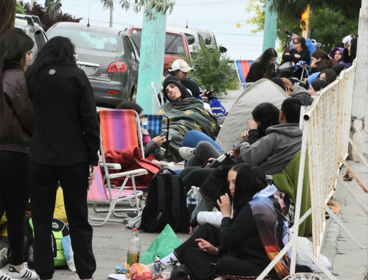 Desde hace más de un día, un grupo de fanáticos de Lali Espósito se encuentra acampando en la vereda del Gimnasio Municipal N° 1 de Trelew. Con gran entusiasmo y dedicación, los seguidores esperan ansiosamente el momento de ver a su ídola pop sobre el escenario. Ellos están con reposeras, mate, algún que otra comida que les acercan con carteles, banderas, remeras y más de Lali.