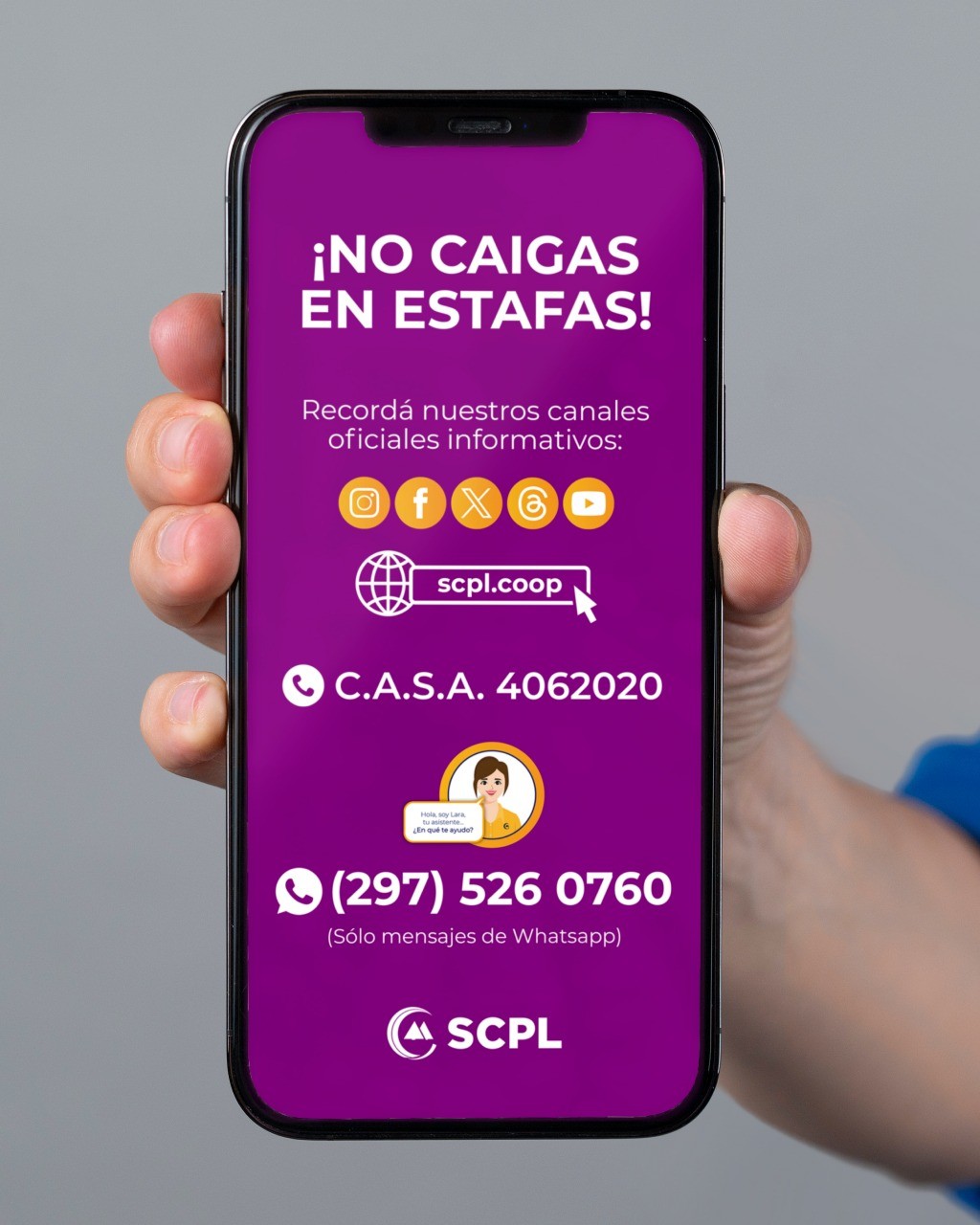 La Sociedad Cooperativa Popular Limitada de Comodoro Rivadavia advirtió a sus asociados y usuarios, sobre nuevos casos de estafas utilizando a la SCPL como referencia. Nuevamente se han detectado modalidades de estafa a través de mensajes de WhatsApp y llamadas telefónicas en nombre de la entidad.
