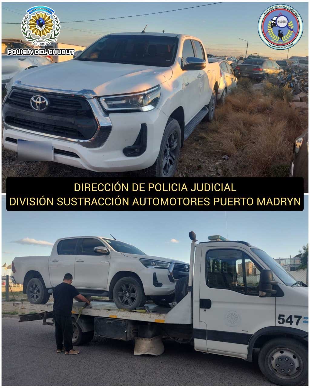 Este jueves en la ciudad del golfo, se pudo recuperan una camioneta robada gracias a la coordinación entre las divisiones de Sustracción de Automotores de Puerto Madryn y Trelew. El vehículo en cuestión es una camioneta Toyota Hilux, doble cabina, que había sido robada aproximadamente dos semanas atrás en la ciudad de Neuquén.