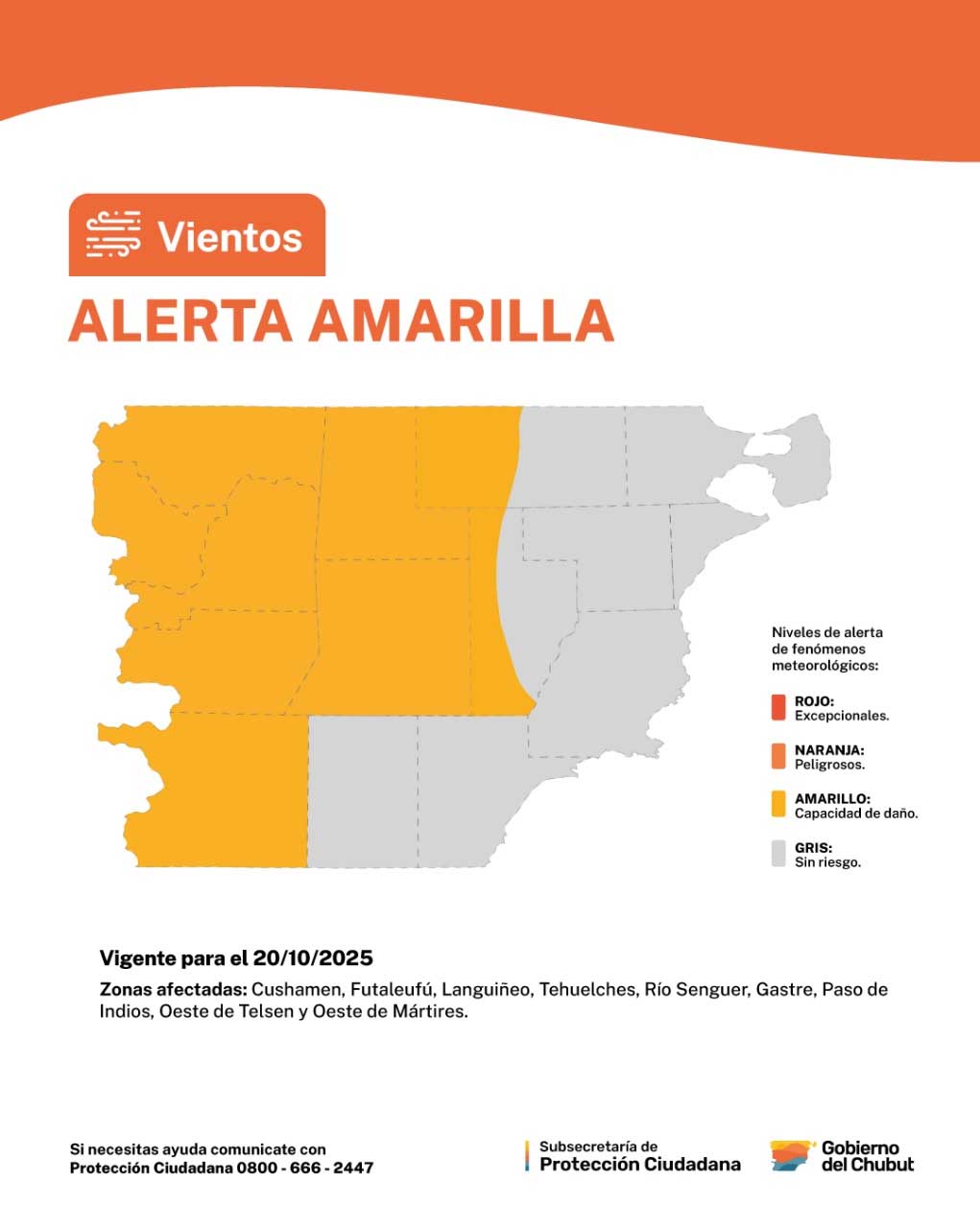 La Subsecretaría de Protección Ciudadana, dependiente del Ministerio de Seguridad y Justicia, informó sobre la zona de cobertura del alerta amarilla por vientos, emitido por el Servicio Meteorológico Nacional prevista para la tarde de este lunes 20 de octubre.