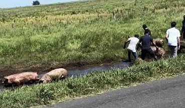 Un camión jaula que transportaba cerdos volcó este lunes al mediodía en el kilómetro 179 de la Ruta Nacional 7, cerca de Ingeniero Silveyra, en el partido de Chacabuco, provincia de Buenos Aires.