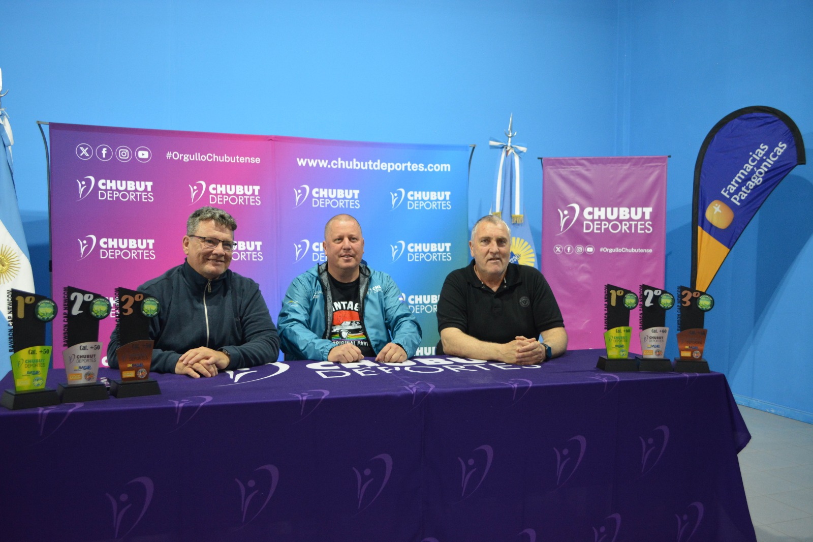 Participaron de la presentación Agustín Landau, gerente de Prensa y Marketing de Chubut Deportes, Gastón Williams, director de Deportes de la Municipalidad de Rawson, y Ariel Caballero, presidente del club organizador.