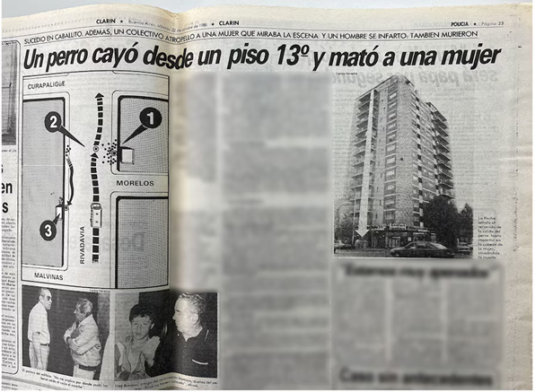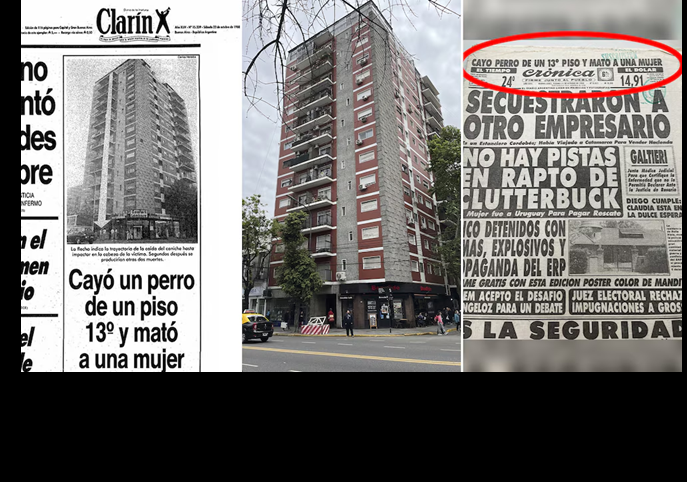 La caída del perro y la muerte de tres personas que pasaban por el lugar fue una noticia tan insólita que ocupó la primera plana de algunos diarios de la época y hoy, 34 años después, sigue impactando.