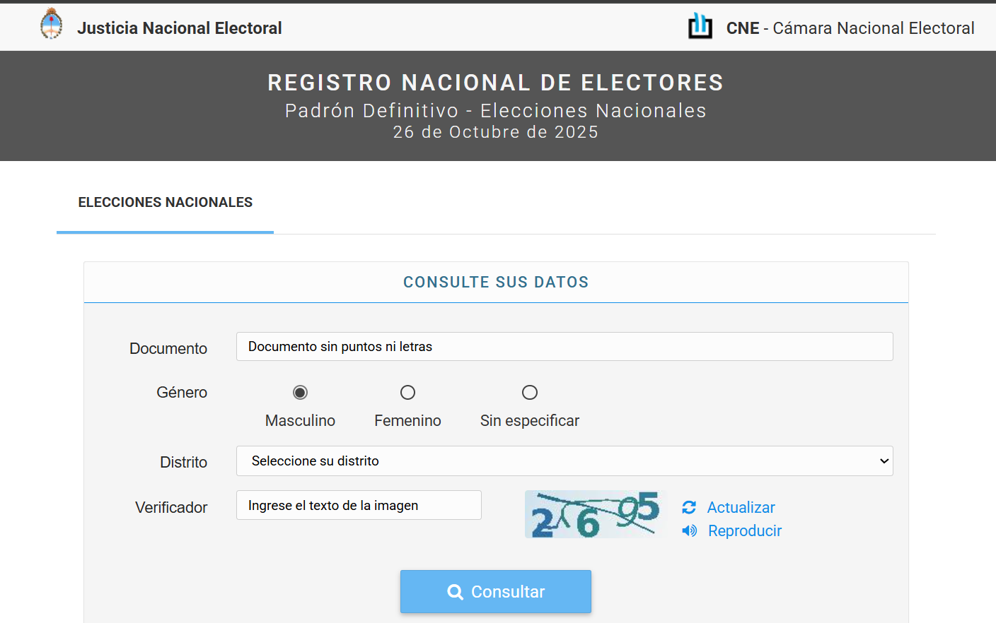 Completá cada casillero del formulario con número de DNI, sin puntos. Seleccioná el Género según figura en tu DNI. Elegí la provincia donde votás, de acuerdo con el domicilio que consta en tu DNI. Copiá exactamente el número verificador te aparece en la pantalla.