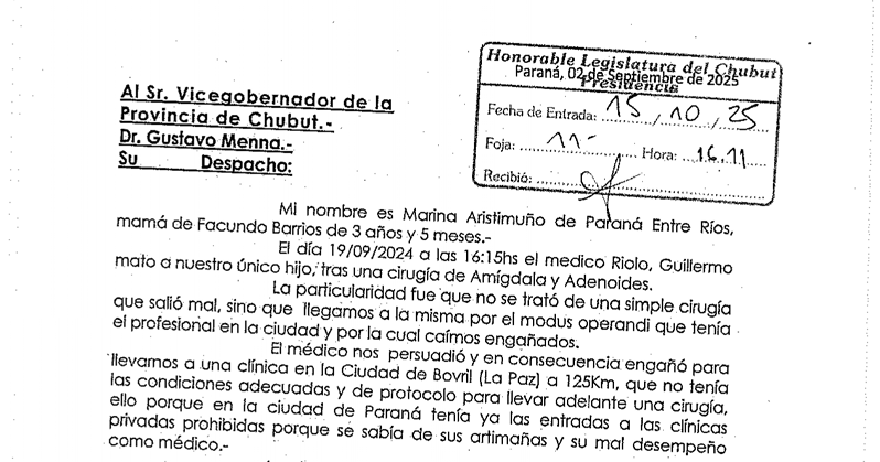 Marina Aristimuño, madre entrerriana, presentó ante la Legislatura una nota dirigida al vicegobernador Gustavo Menna en la que advierte que el médico Guillermo Gabriel Riolo, imputado por el homicidio culposo de su hijo Facundo, continúa ejerciendo la medicina y está habilitado para ejercer en Chubut, pese a tener la matrícula suspendida en Entre Ríos.