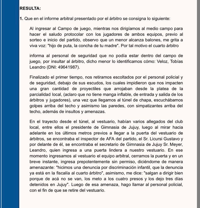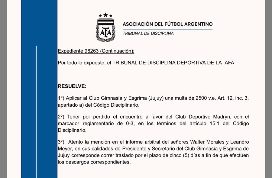 La decisión se tomó luego de analizar el informe presentado por Comesaña y los descargos de ambas instituciones. En su resolución, el Tribunal aplicó al club jujeño una multa de 2.500 entradas (v.e) y confirmó la pérdida del partido, tal como establece el artículo 15.1 del Código Disciplinario.