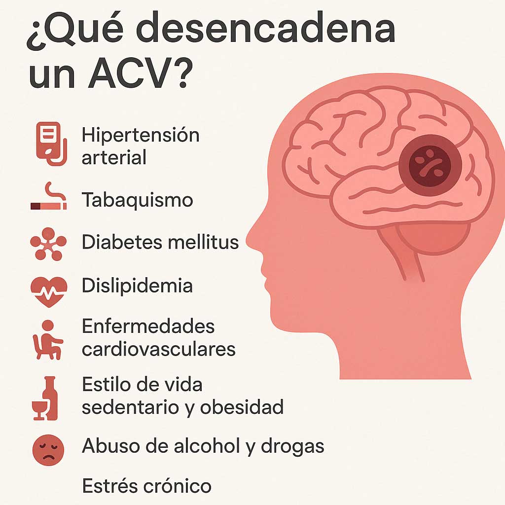 El ACV, también conocido como ictus o infarto cerebral, ocurre cuando se interrumpe el flujo sanguíneo al cerebro (ACV isquémico) o cuando un vaso sanguíneo cerebral se rompe y provoca un sangrado (ACV hemorrágico). En ambos casos, la falta de oxígeno daña rápidamente las neuronas y puede dejar secuelas permanentes si no se actúa de inmediato.