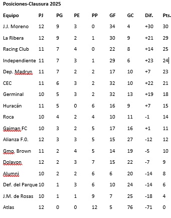 Moreno goleó 8 a 0 a Atlas y sigue en la cima con 30 puntos y La Ribera venció 2 a 0 a Guillermo Brown y está al acecho con 29 unidades.