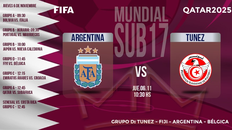 La Selección argentina le ganó 1-0 a Túnez, en un partido correspondiente a la segunda fecha del Grupo D, y se aseguró la clasificación a los 16avos de final del Mundial Sub 17 que se lleva a cabo en Qatar.