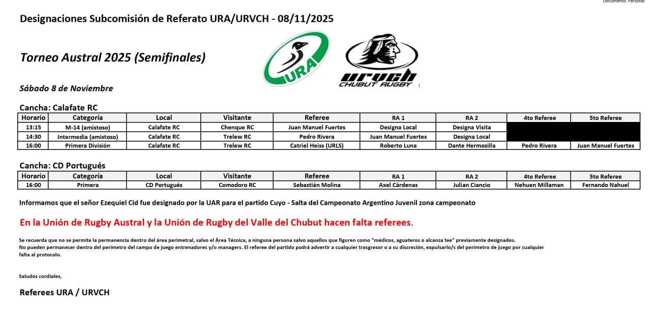El otro juego, entre Calafate RC (2°) y Trelew RC (3°), también se jugará en Comodoro a las 16hs, con el referato de Catriel Heis, de la Unión de Rugby de Lagos del Sur.