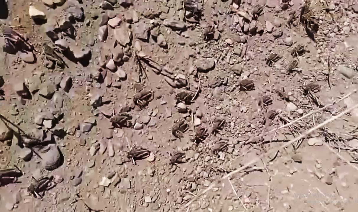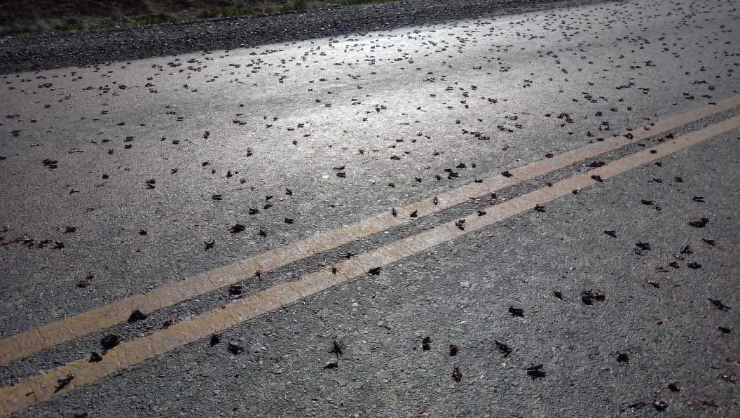 La Tucura Sapo avanza rápidamente sobre la Ruta 25 a la altura de Tecka y ya preocupa a sus pobladores. Videos subidos por personas que transitan por la zona muestra la cantidad de insectos cubriendo la calzada y sobre la ruta.