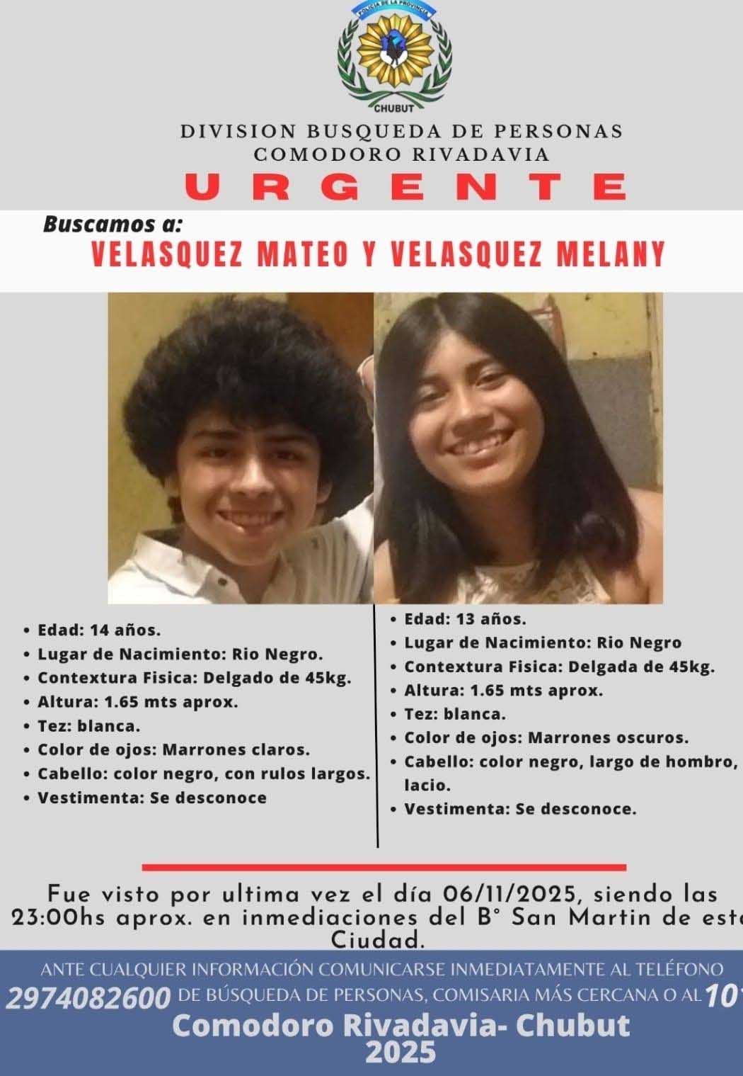 La División Búsqueda de Personas de Comodoro Rivadavia solicita colaboración para localizar a los hermanos Mateo Velásquez (14 años) y Melany Velásquez (13 años), quienes se ausentaron de su domicilio en el barrio San Martín durante la jornada del jueves 6 de noviembre cerca de las 23 horas y aún no regresaron.