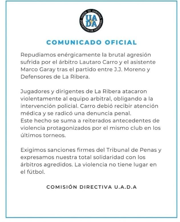 En tanto, hubo un comunicado de la AANECH repudiando los hechos virulentos. UADA, el gremio de la mayoría de los árbitros del Interior, también emitió un texto similar. La filial trelewense de UADA se expresó en el mismo sentido.