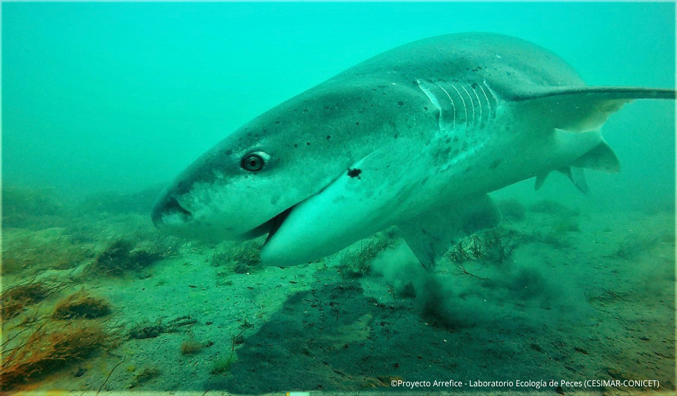 En febrero de este año, científicos del Laboratorio de Ecología de Peces del Centro para el Estudio de los Sistemas Marinos (CESIMAR-CONICET) e integrantes del Laboratorio de Ecología de Peces, marcaron en la Ría de Puerto Deseado, Santa Cruz, un ejemplar de tiburón gatopardo (Notorynchus cepedianus).
