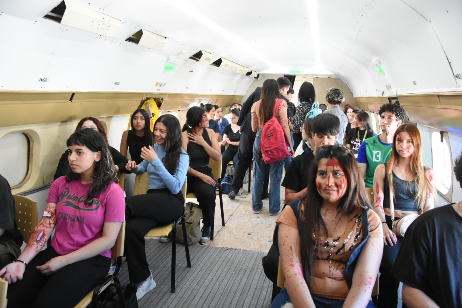 Durante la simulación, los tripulantes de cabina —exalumnos del Aeroclub— evacuaron a los pasajeros mientras los socorristas ejecutaron el protocolo de triage, clasificando a las víctimas según la gravedad de sus heridas en zonas verdes, amarillas y rojas, dispuestas en carpas de emergencia dentro del predio.