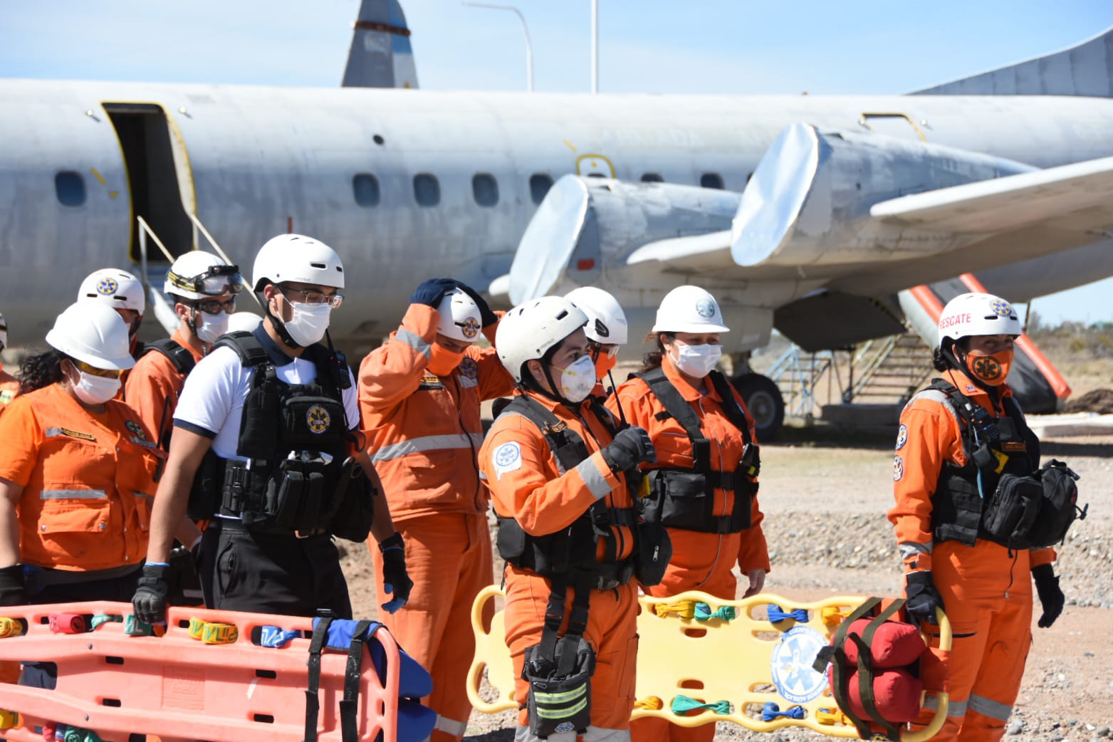 Desde la mañana se desarrollaron capacitaciones teóricas y prácticas en radiocomunicación, control de hemorragias y emergencias en aviación. El ejercicio final consistió en la recreación de un vuelo con desperfectos técnicos que obliga a un aterrizaje de emergencia y activa la respuesta de los equipos de rescate.