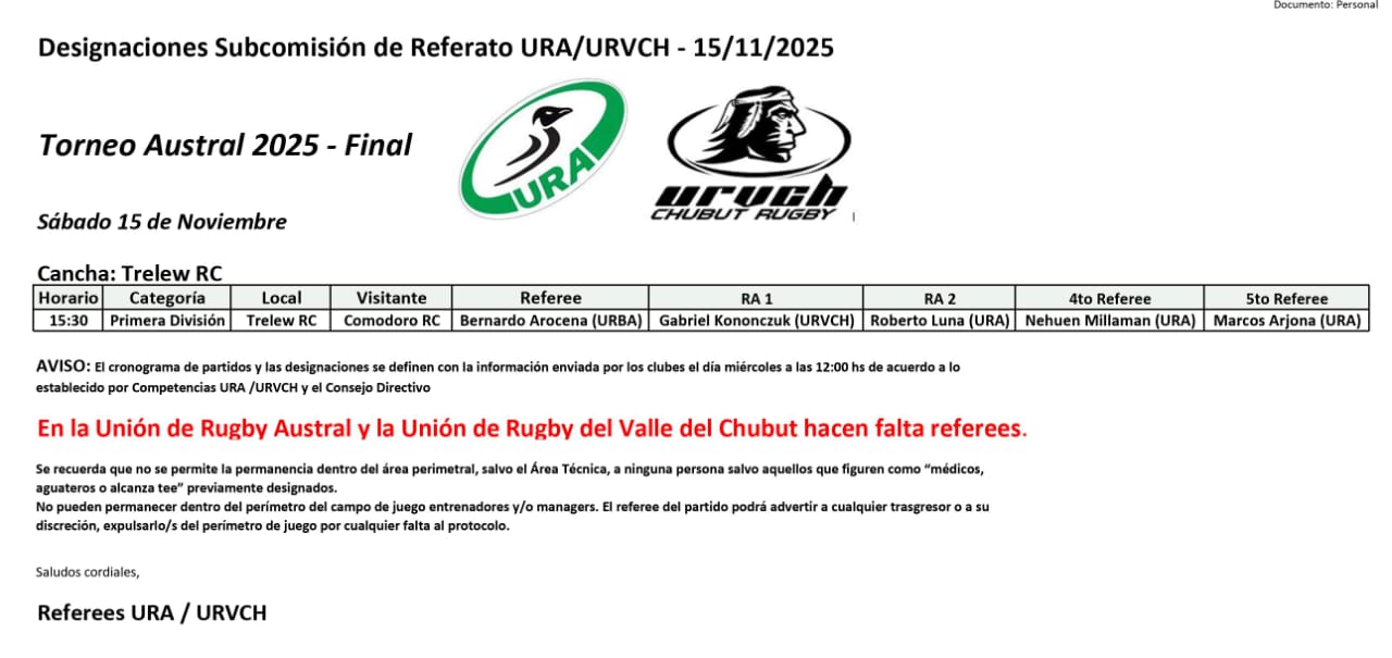 Ya está todo listo para la gran final del Torneo Austral 2025 entre Trelew RC y Comodoro RC, que se disputará el próximo sábado 15 de noviembre desde las 15.30 en cancha de las "Cebras".