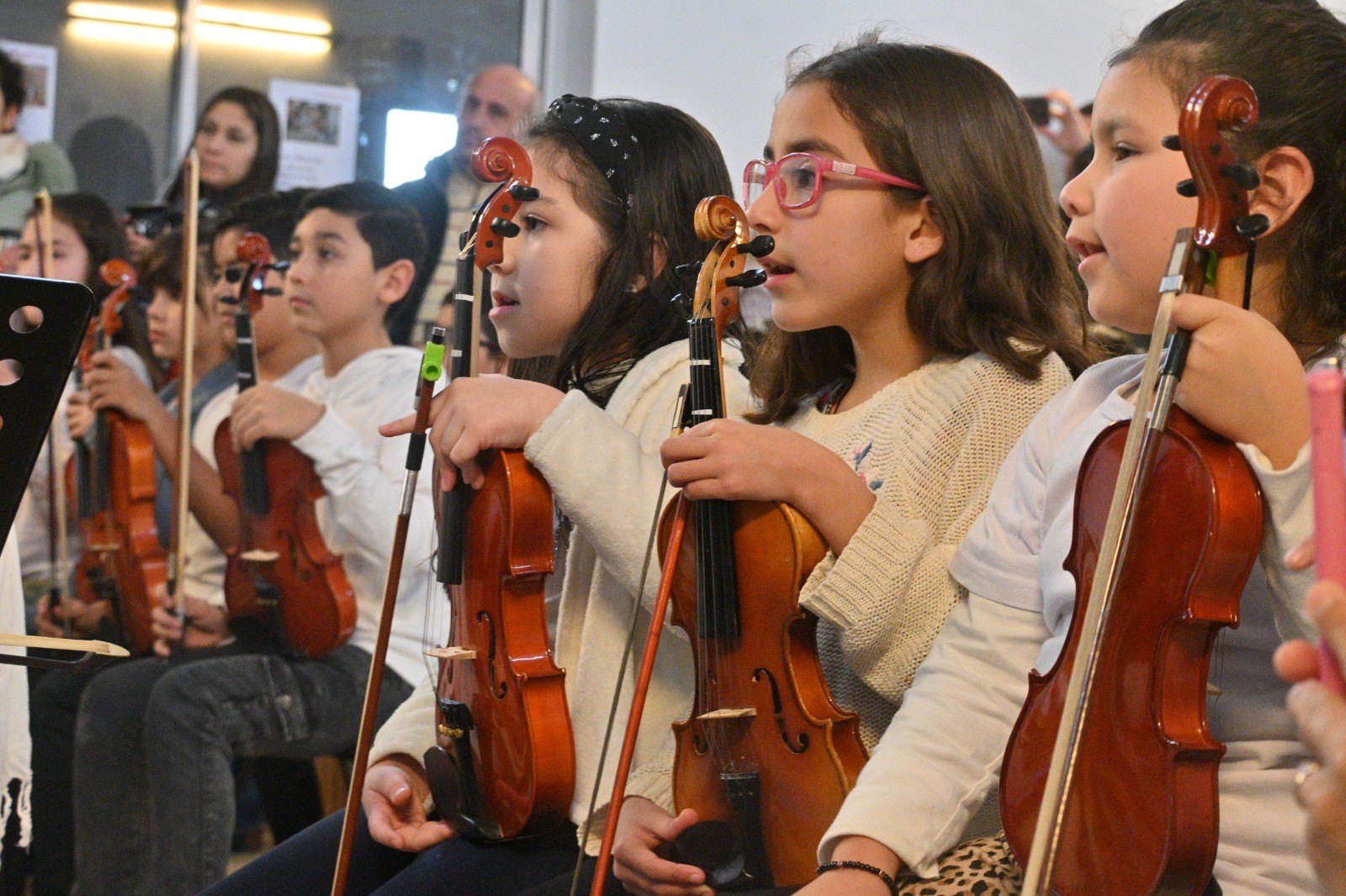 El primer concierto tuvo lugar en el SUM de la Escuela Mutualista, donde se presentó el grupo Iniciales de la orquesta, integrado por quince niños y niñas de entre 6 y 11 años que aprenden violín y violoncello. Bajo la coordinación de Silvina Selzer y Ana María Pomar, junto a los docentes Milena Jaramillo y Elías Jofré, quienes fueron parte de la Orquesta Infanto Juvenil Municipal, el grupo compartió un repertorio con obras especialmente adaptadas para instrumentos de cuerda.