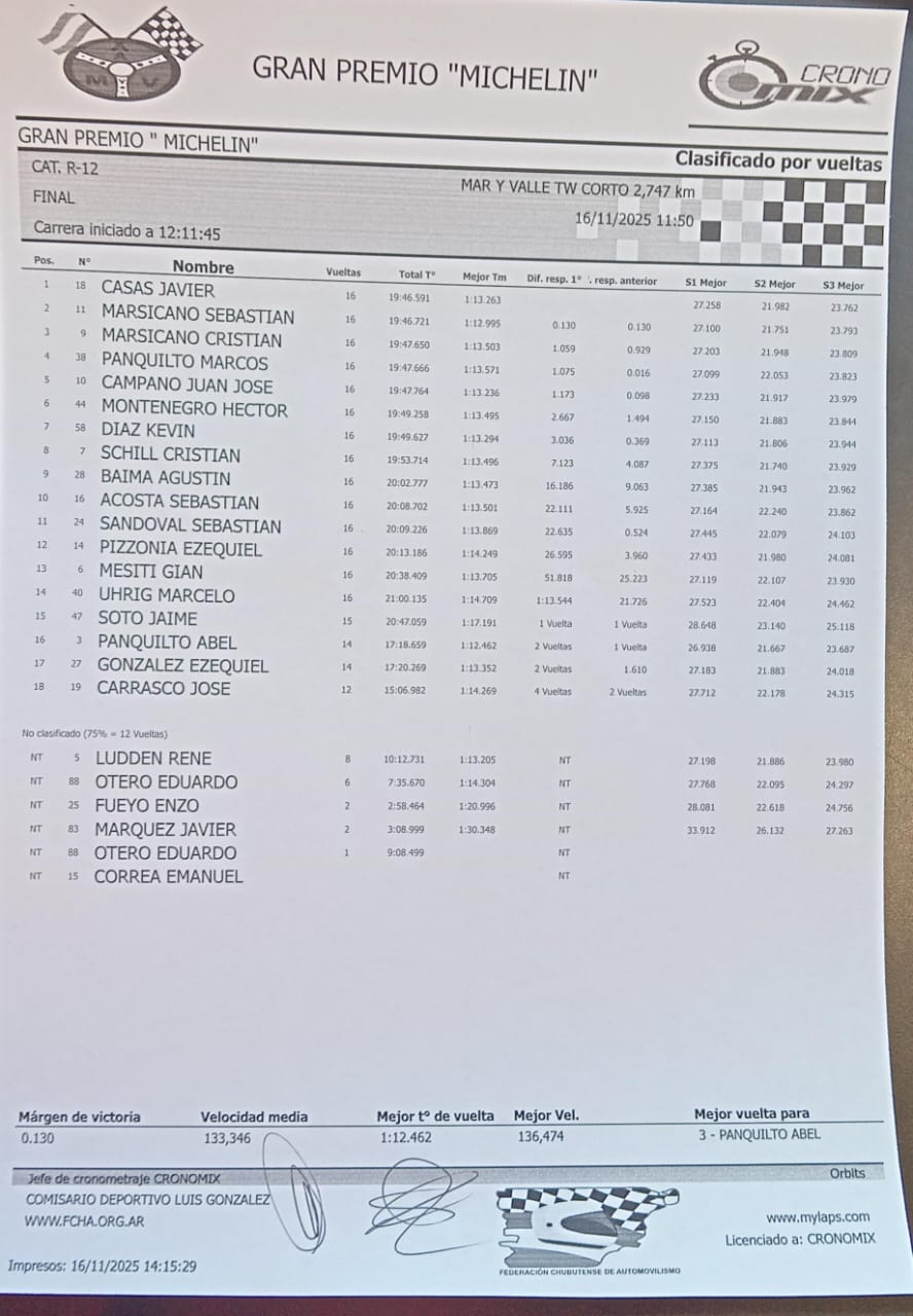 Martín Muñoz de Playa Unión ganó la carrera de 16 vueltas con 20:50.486, en su 40° presentación en la categoría, delante de Rubén Grier y el esquelense Santiago Acevedo, otros de los ganadores del 2025.