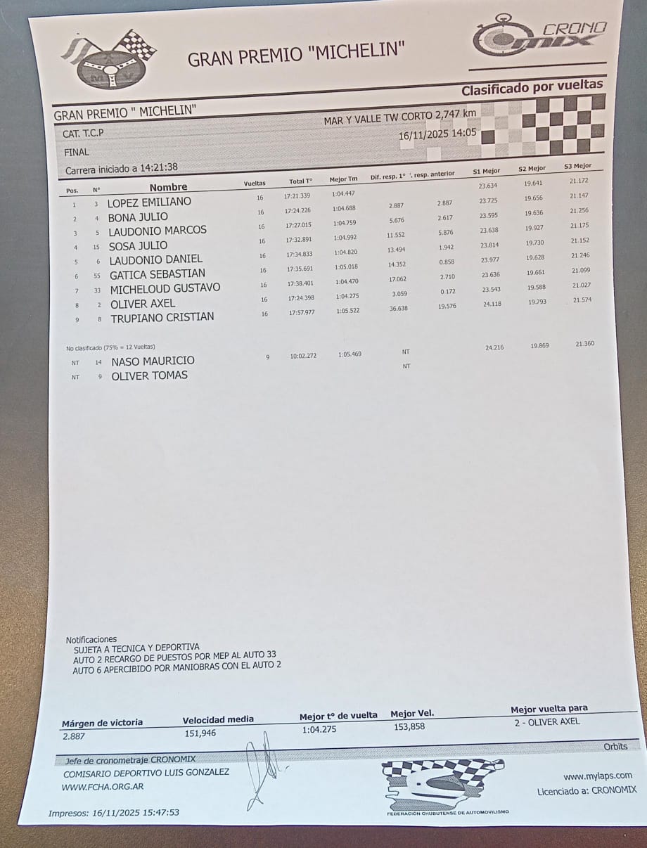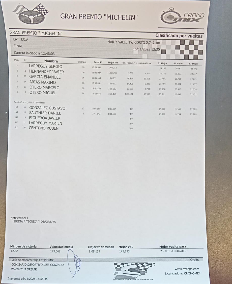 "Miguelito" Otero, el de Kilómetro 8 de Comodoro, llegó con una masa trasera rota y la rueda desinflada, pero con el sexto lugar -el último en completar el total de vueltas- aseguró su primer título en el TC Austral, después de los dos que había logrado en la Renault 12 y de sus incursiones en el Top Race y Turismo Nacional. Otero ya había peleado el título con Larreguy en 2024 y con Enrique Verde en 2023.