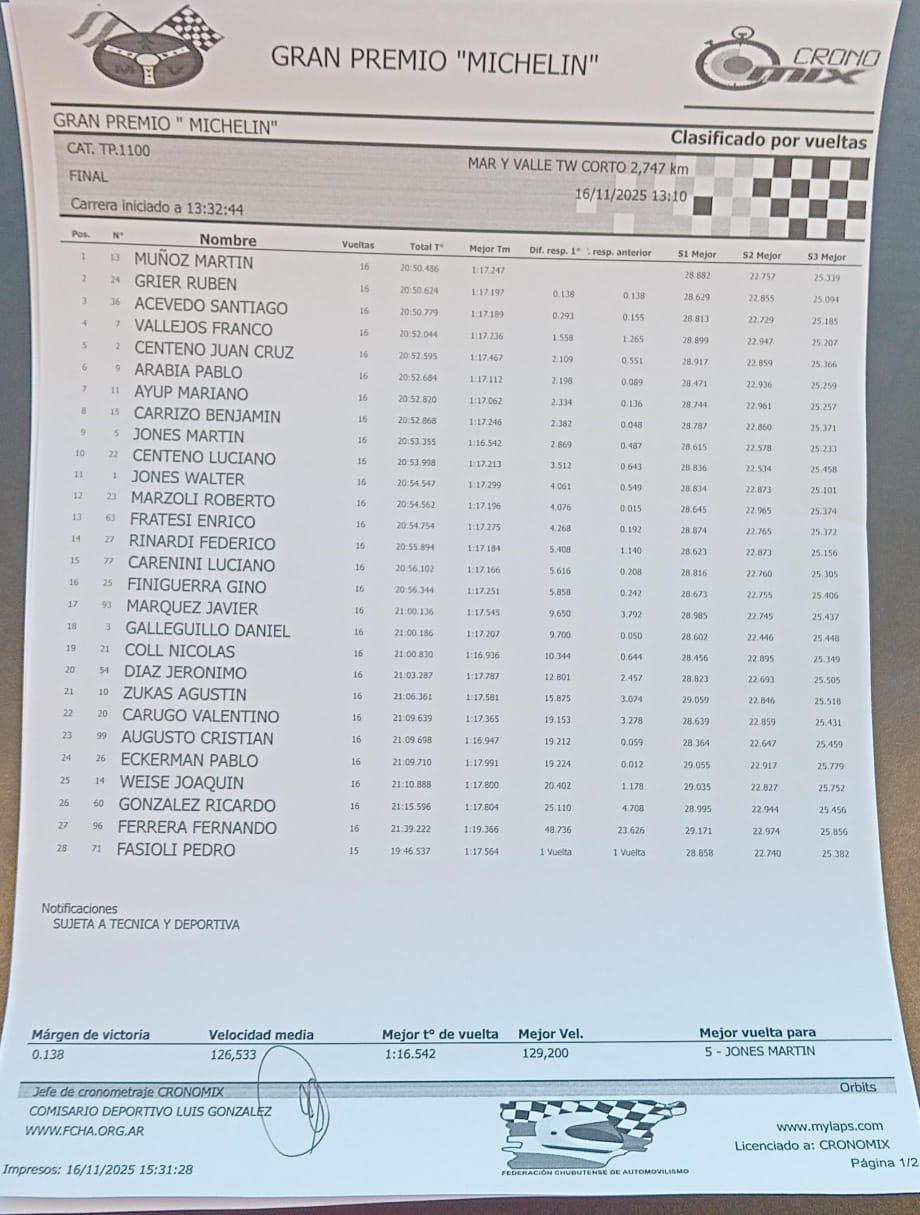 Martín Jones había tenido un sábado devastador, con un abandono en la serie, pero a pesar de haber largado en el cajón 34, el triunfo de Martín Muñoz y el haber llegado noveno en la final, en una remontada estupenda, le permitió festejar el primer título después de ocho años de trabajo en el TP 1.100.