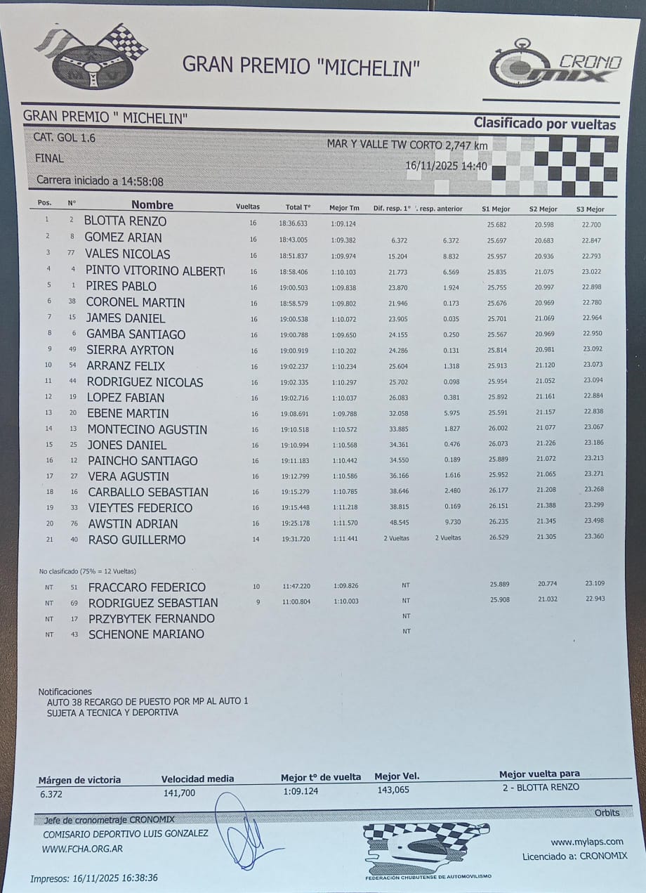 En tanto, Pablo Pires se convirtió en el primer tricampeón de la Gol, al terminar quintoen la final que ganó también con holgura Renzo Blotta, el más ganador del año, que sólo terminó a un punto y medio en la lucha por el campeonato. Pires, que sufrió la pinchadura de un neumático, totalizó con 295,5 puntos contra 294 de Blotta: "el auto fue contundente, hicimos lo que habìa que hacer, son carreras", se consoló Blotta, que tuvo como escoltas a Arián Gómez y Nicolás Vales.
