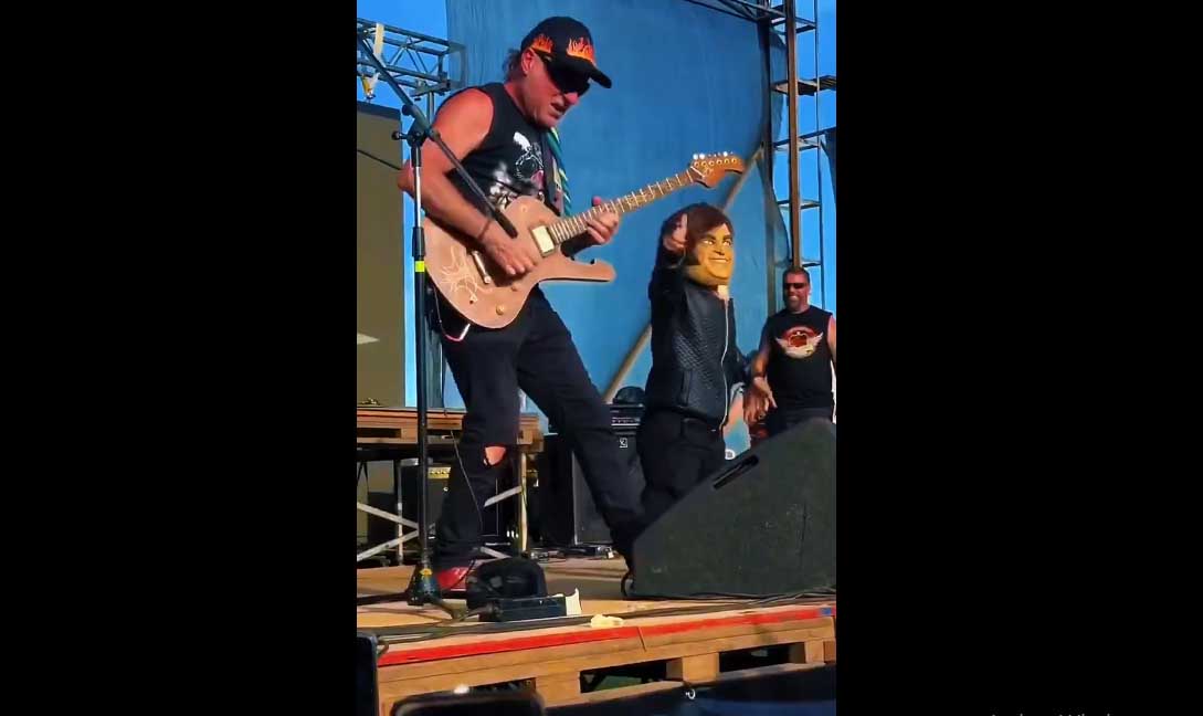 La escena se dio durante el “Festival tdF5Kg Dama’s Day” en Luján, un evento que reúne a los amantes de las Harley Davidson. Mientras la banda interpretaba su popular tema, un hombre de baja talla disfrazado de Javier Milei (con una máscara que imitaba el rostro del Presidente) apareció sobre el escenario.