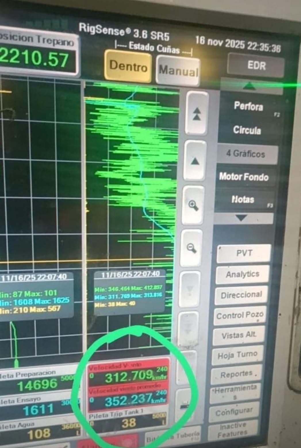 De esta manera, el mencionado yacimiento hidroicarburìfero superó todos los valores históricos de viento, aunque a una veocidad constante de 312 km/h, todo en el marco de la alerta roja que afecta a toda la región y que obligó al paràlisis de lka mayoría de las actividades..