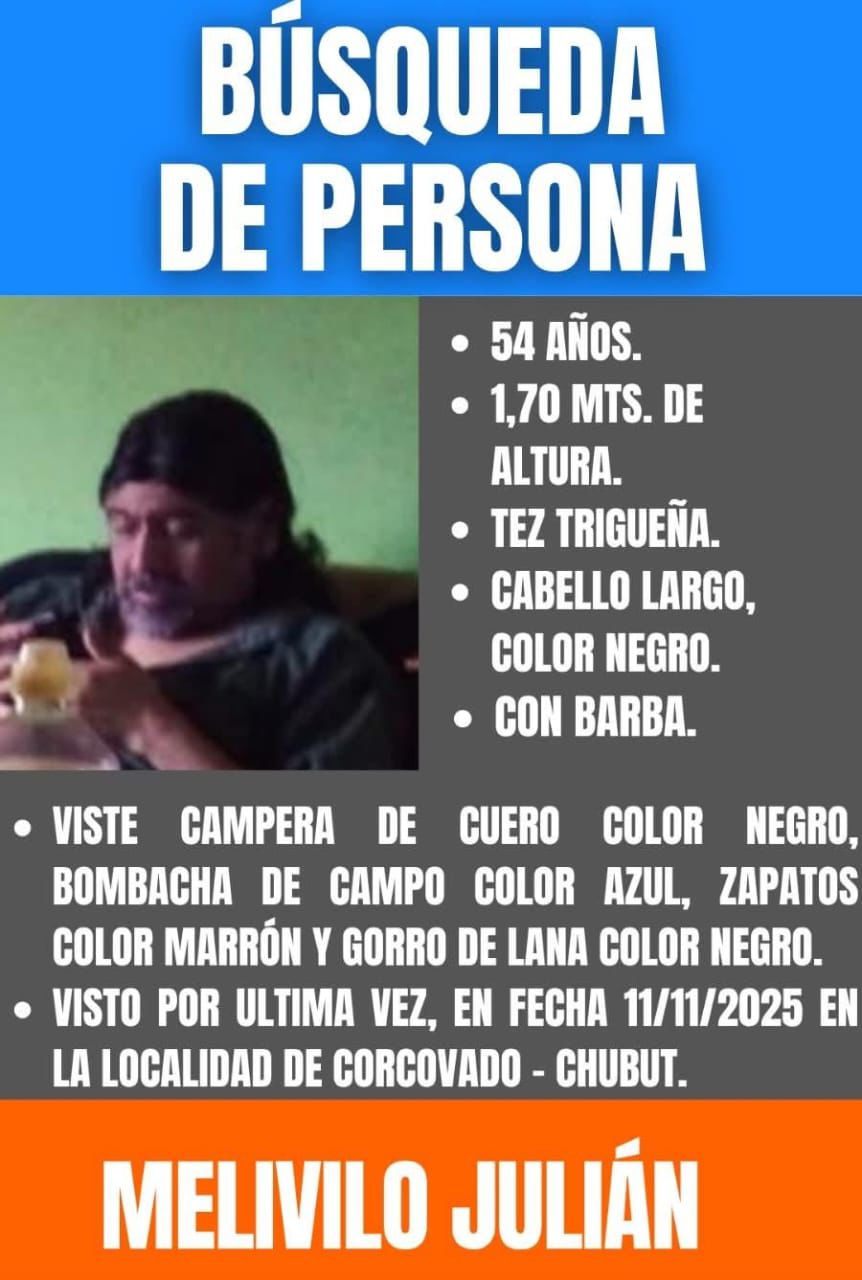 Este martesllegó a Jornada un sentido mensaje de Aurelia, hermana de Julián Melivilo de 54 años, ya que lo busca desde el martes 11 de noviembre. La última vez que lo vieron fue en Corcovado, donde vive. Él sufrió un accidente hace dos años y desde ese momento sufre de epilepsia y pérdida de memoria.
