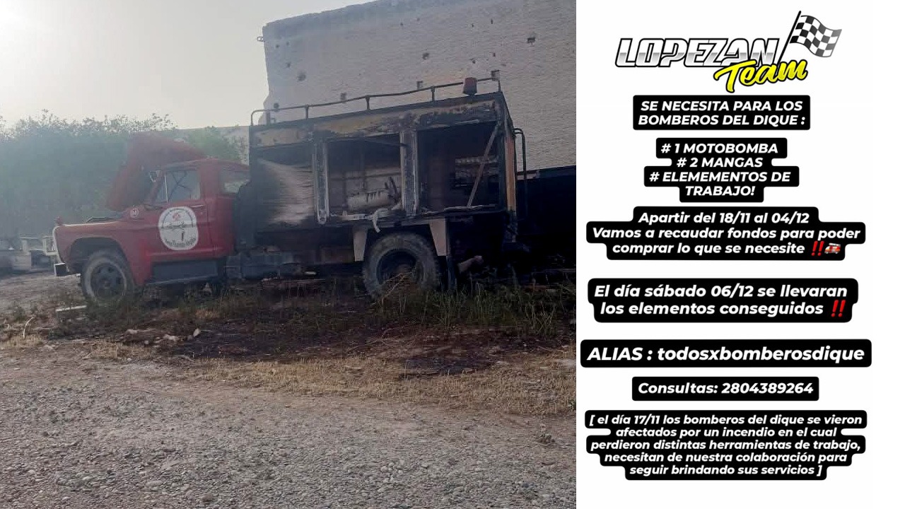 El Team fierrero Lópezan de Trelew, organizó una colecta de fondos para ayudar a los Bomberos Voluntario del Dique Florentino Ameghino. Luego del temporal de viento que originó un incendio, sufrieron graves pérdidas materiales. El objetivo principal, es recaudar dinero para comprar equipamiento de trabajo esencial, específicamente una motobomba y dos mangas.