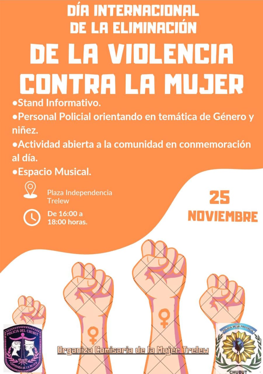 Este martes 25 de noviembre, en el Día Internacional de la Eliminación de la Violencia contra la Mujer, la Comisaría de la Mujer a partir de las 16 realizará un evento en la Plaza Independencia de Trelew. Es en el marco de su aniversario N ° 22 al servicio de la comunidad.
