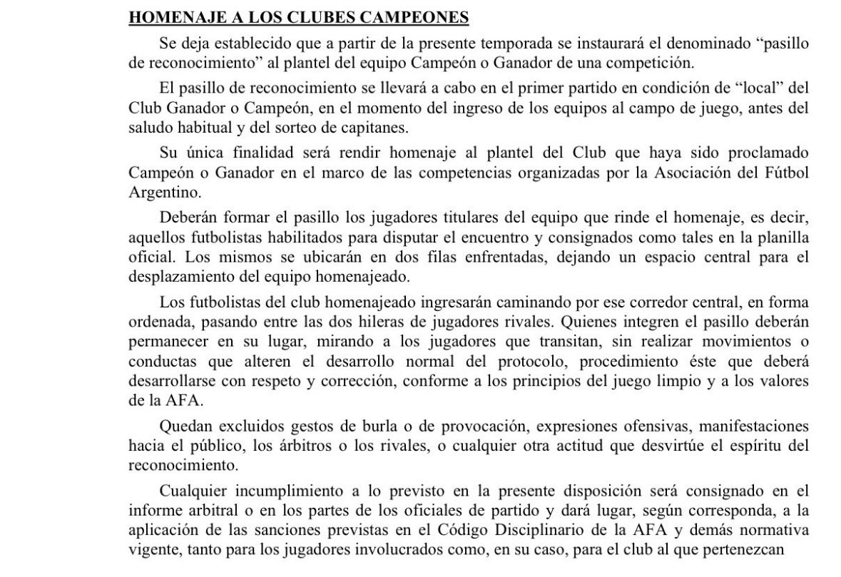 En el mismo documento se detalla que “los futbolistas del club homenajeado ingresarán caminando por ese corredor central, en forma ordenada, pasando entre las dos hileras de jugadores rivales”, mientras que “quienes integren el pasillo deberán permanecer en su lugar, mirando a los jugadores que transitan, sin realizar movimientos o conductas que alteren el desarrollo normal del protocolo, procedimiento éste que deberá desarrollarse con respeto y corrección”.