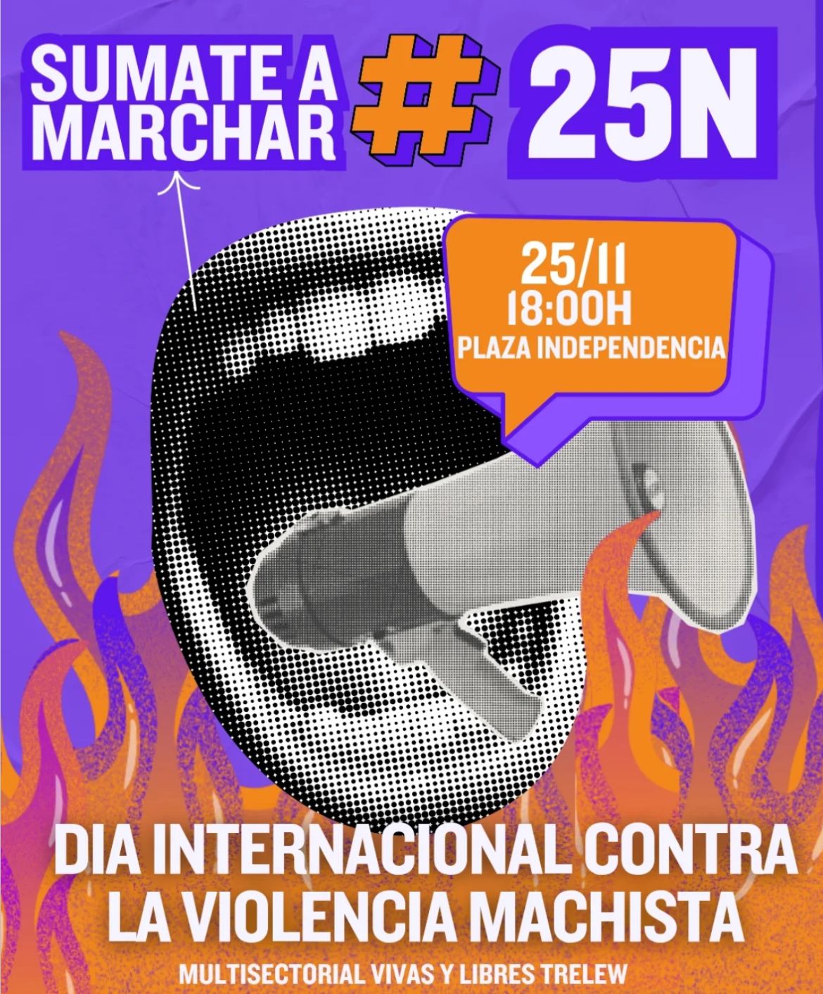 La multisectorial Vivas y Libres Nos Queremos, informó que este martes 25 de noviembre, en el Día Internacional de la Eliminación de la Violencia Machista (25N), en Trelew se realizará una marcha como cada año. La cita es en la Plaza Independencia y a las 18 comenzarán a marchar por las calles céntricas de la ciudad.