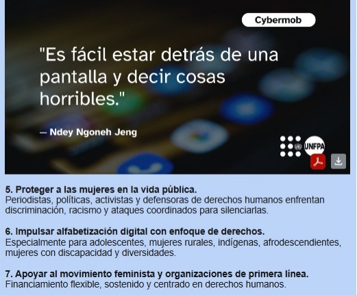 La evidencia más reciente —incluidas nuevas investigaciones apoyadas por el UNFPA— muestran que la violencia de género facilitada por la tecnología está aumentando y adquiriendo nuevas formas a medida que la inteligencia artificial evoluciona. Como organización líder en la prevención y respuesta a la violencia basada en género, el UNFPA reafirma su compromiso para hacer que los espacios digitales sean seguros y equitativos para todas las personas.