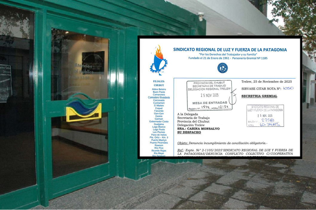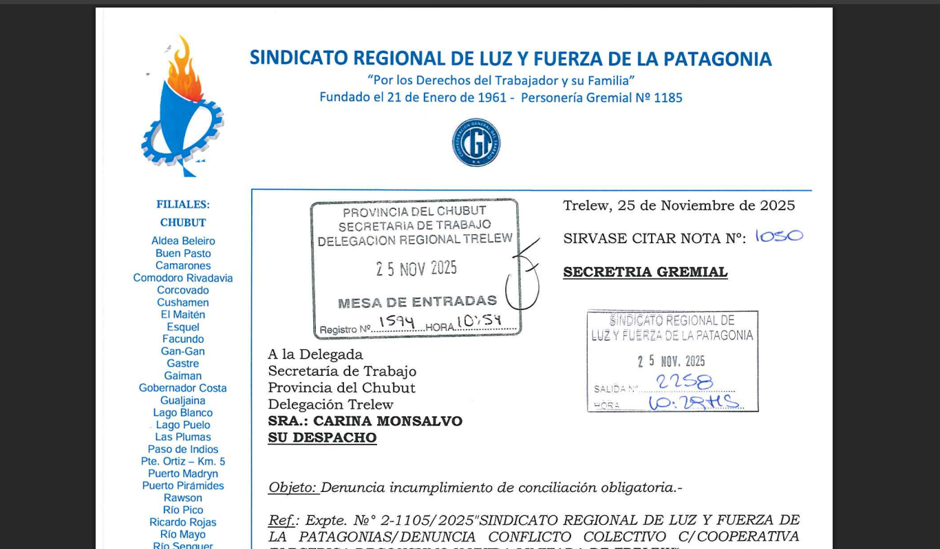 En una nota enviada a la Delegada local de la Secretaría de Trabajo, Carina Monsalvo, el Sindicato Regional de Luz y Fuerza de la Patagonia denunció a la Cooperativa Eléctrica de Trelew por “incumplimiento de la conciliación obligatoria”, que había sido dictada por el organismo laboral el 13 de noviembre pasado.