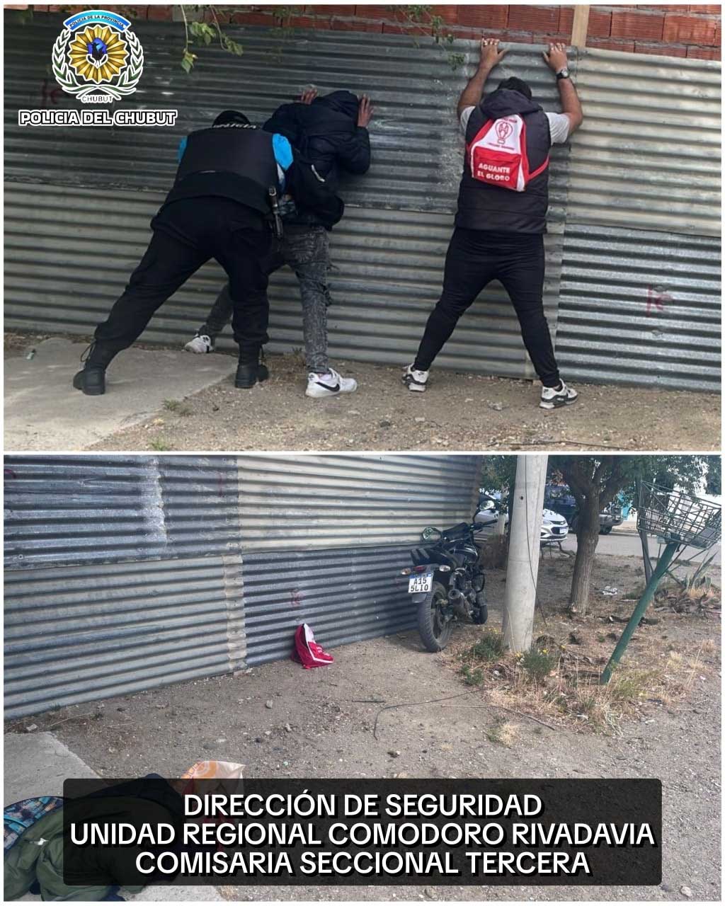 Este martes, a las 10:30 h de la mañana, personal de la Comisaría Tercera de Comodoro Rivadavia, recibe un llamado informando que dos sujetos robaron una moto y que la trasladaban a pie mientras intentaban encenderla.