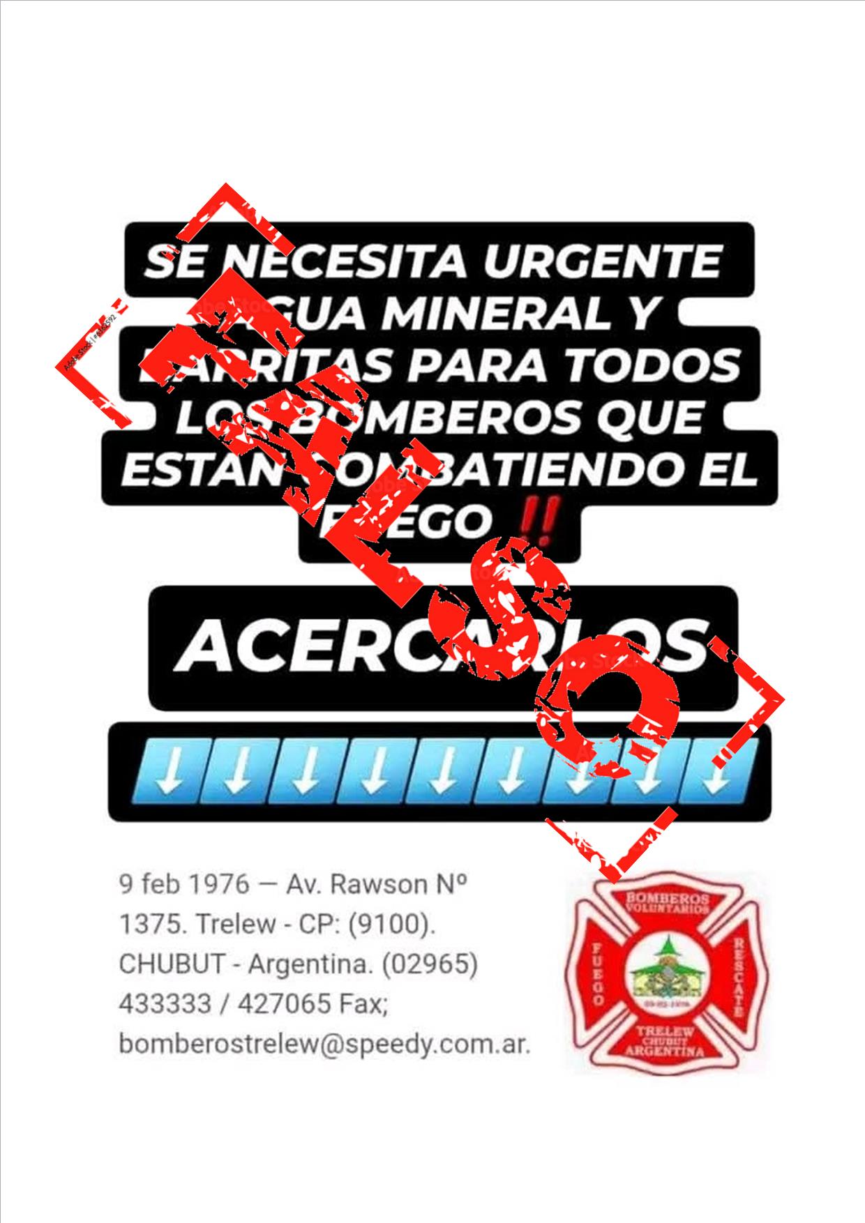 Este jueves al mediodía los Bomberos Voluntarios de Trelew desminitieronuna colecta a beneficio de ellos por estar combatiendo el fuego. A través de Facebook informaron que:“Desde la Comisión Directiva y la Jefatura de nuestra Asociación queremos aclara que no estamos solicitando ningún tipo de donación o colaboración para nuestros Bomberos.