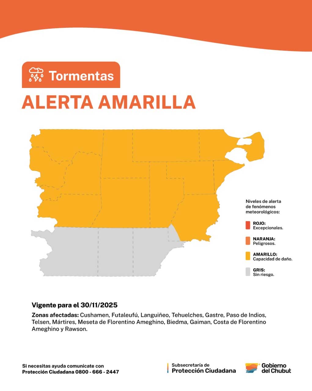 La Subsecretaría de Protección Ciudadana, dependiente del Ministerio de Seguridad y Justicia, informó sobre la actualización del alerta amarilla por tormentas, emitido por el Servicio Meteorológico Nacional prevista desde la madrugada de este domingo 30 de noviembre y hasta horas de la tarde.