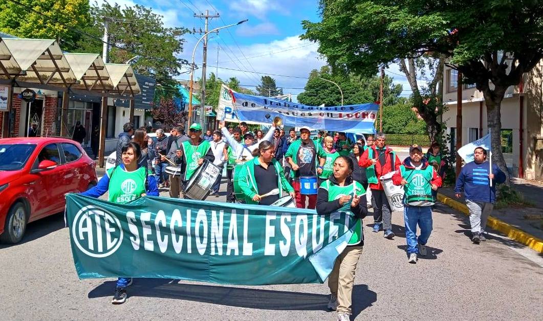 Trabajadores auxiliares de educación, y quienes se encuentran enmarcados en la Ley I- 74 (ex 1.987), se concentraron este martes en la plaza San Martín de Esquel, a fin de visibilizar el reclamo de apertura de paritarias salariales.