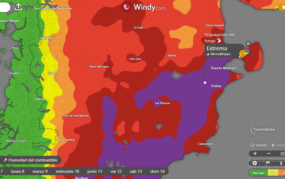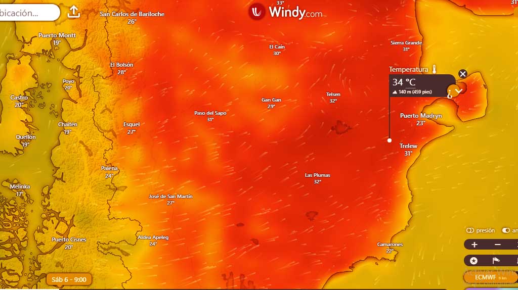 En la zona cordillerana como en la localidad de Esquel los valores máximos podrían alcanzar los 26°C según el pronóstico elaborado por el sitio meteorológico Windy.#