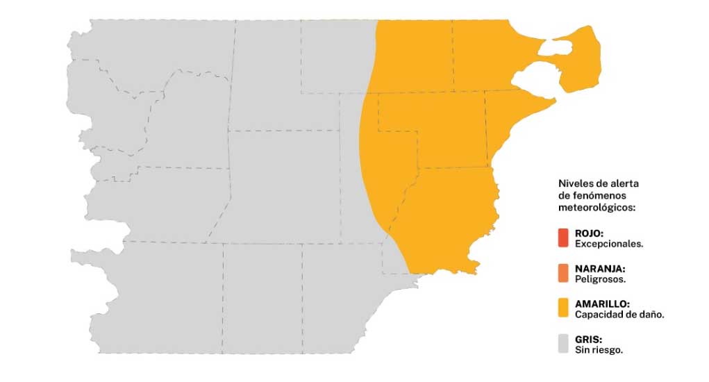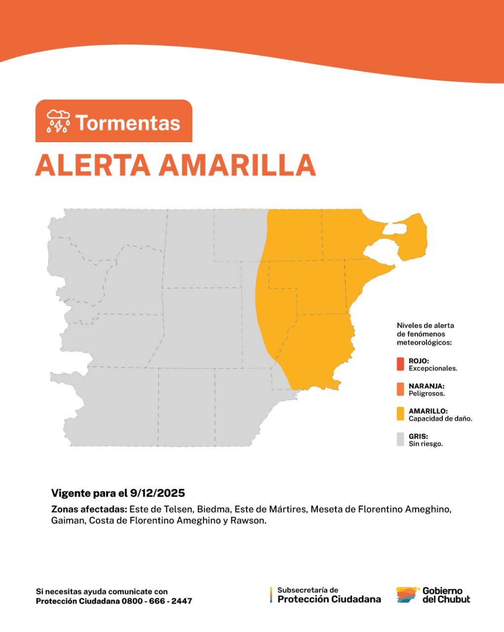 La Subsecretaría de Protección Ciudadana, dependiente del Ministerio de Seguridad y Justicia, informa sobre la zona de cobertura del alerta amarilla por tormentas, emitido por el Servicio Meteorológico Nacional prevista para la tarde del martes 9 de diciembre.