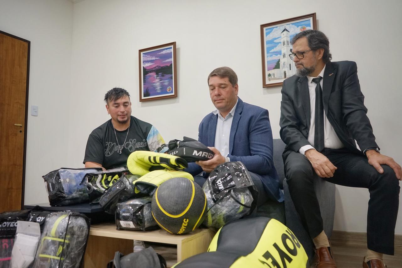 El intendente de Rawson, Damián Biss, encabezó la entrega de equipamiento al Director de la escuela, Bruno Triviño, quien recibió siete pares de guantes de 16 onzas, dos bolsas, cuatro bochas, cuatro pesas rusas, 100 kg de discos, una barra de 150 cm y seis pares de mancuernas de 2 kg. Acompañó la actividad el secretario de Gobierno y Seguridad Ciudadana, Ricardo Furci.