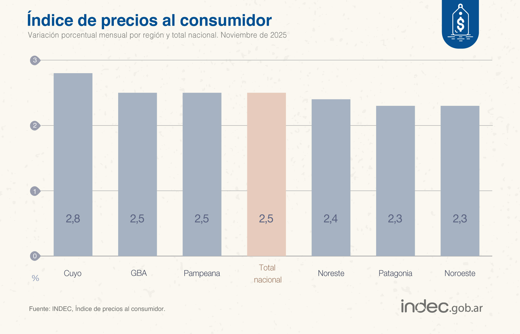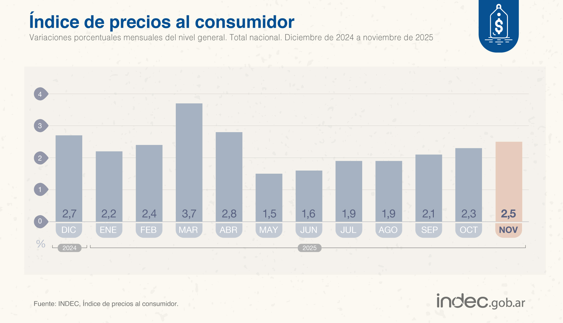 El número del penúltimo mes del año se mantuvo en línea con lo esperado por distintas consultoras, que proyectaban una inflación entre 2,3% y 2,5%. En particular, EcoGo y Equilibra habían pronosticado un IPC del 2,5% para noviembre. De esta manera, el índice que difunde el INDEC volvió a acelerarse y queda como el tercer mes con mayor porcentaje -por debajo de marzo (3,7%) y abril (2,5%).