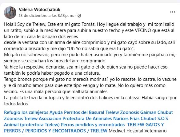 “Hola!! Soy de Trelew, Este era mi gato Tomás, Hoy llegué del trabajo y mi Tomi salió un ratito, subió a la medianera para subir a nuestro techo y este VECINO que está al lado de mi casa le disparó dos veces desde la ventana con un arma de aire comprimido y mi gato cayó sobre su lado, salí corriendo a buscarlo y me dijo "Uh Yo no sabía que era tu gato".
