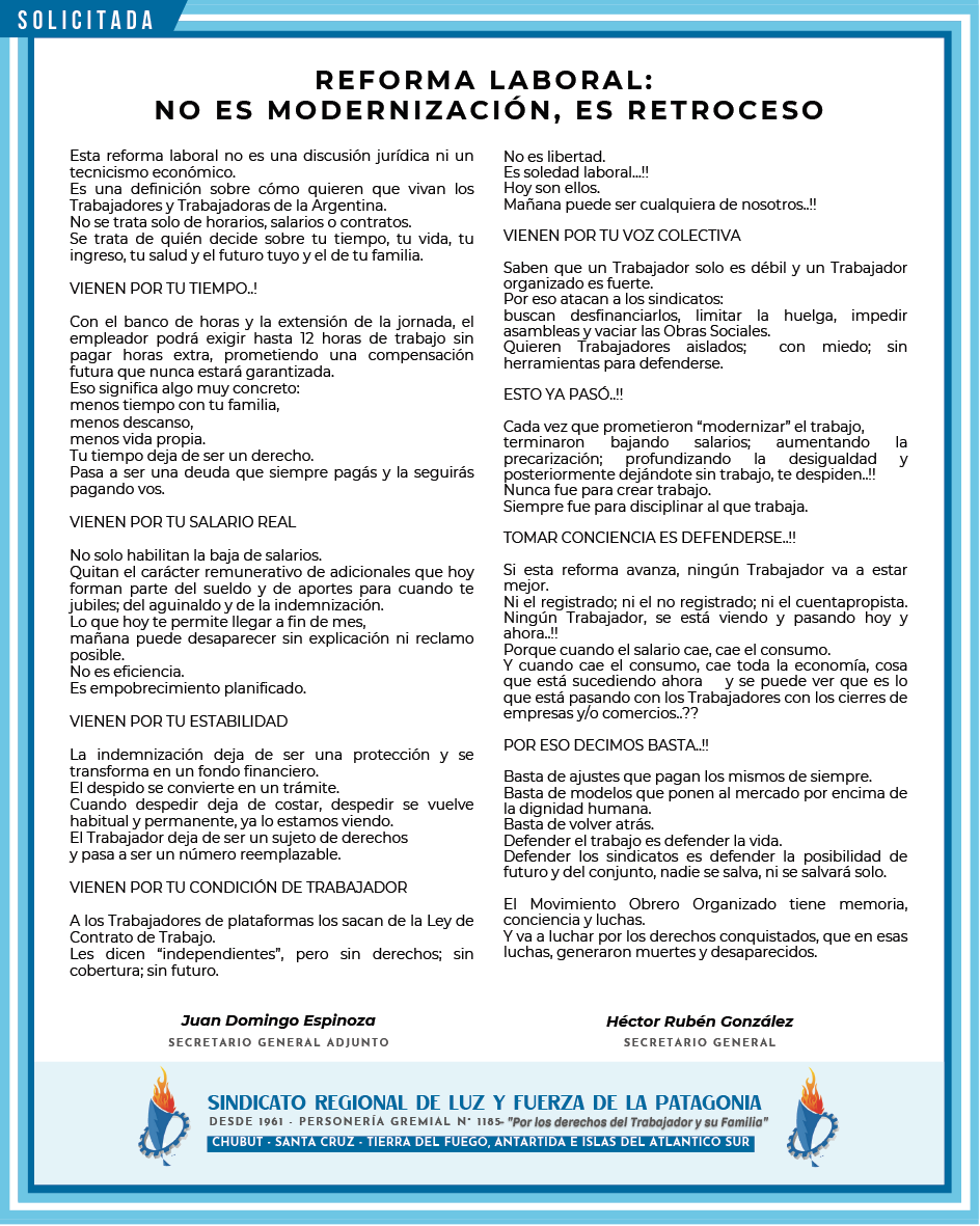 Esta reforma laboral no es una discusión jurídica ni un tecnicismo económico. Es una definición sobre cómo quieren que vivan los Trabajadores y Trabajadoras de la Argentina. No se trata solo de horarios, salarios o contratos. Se trata de quién decide sobre tu tiempo, tu vida, tu ingreso, tu salud y el futuro tuyo y el de tu familia.