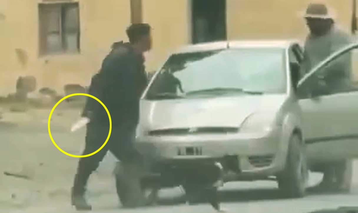 El agredido blande el cuchillo de forma intimidatoria, mientras los tres sujetos lo rodean y lo golpean tratándoles de tirarle el cuchillo. Momentos después, otro sujeto sale del vehículo con un cuchillo y va en auxilio de su compañero.