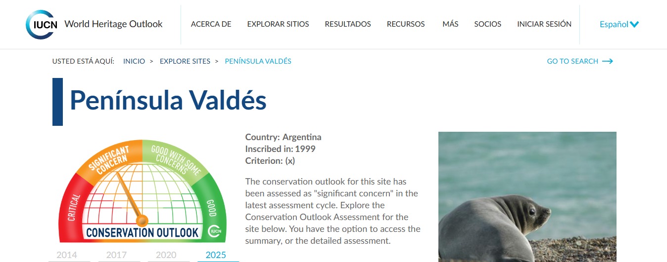 Según el informe de octubre de 2025 para Península Valdés (declarado Patrimonio de la Humanidad en 1999), la perspectiva de conservación de este sitio se ha evaluado como de “preocupación significativa”, catalogándolo como en situación “naranja”.