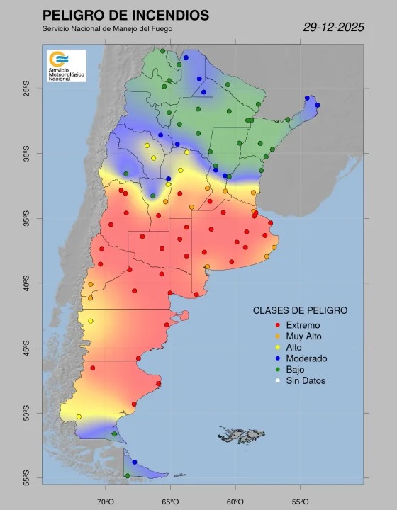 Desde el Servicio Nacional de Manejo del Fuego indican que para este lunes 29 de diciembre hay riesgo extremo de incendios en 10 provincias del país: Buenos Aires, La Pampa, Córdoba, Mendoza, San Luis, Santa Fe, Neuquén, Río Negro, Chubut y Santa Cruz.